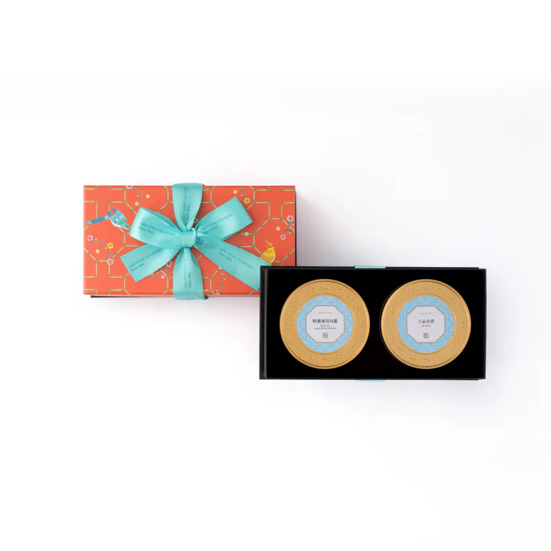 Graceful and luxurious, this twin-tea canister gift box combines classical floral motifs with a silky ribbon bow, symbolizing fortune in pairs.